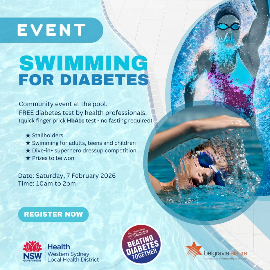 Register for Swimming for Diabetes event! Date: Saturday, 7th February 2026 Time: 10am - 2pm Click here to register
